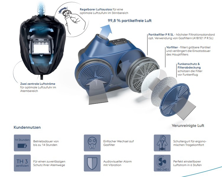 Gase schützt, die beim Schweißen und Schleifen entstehen können. Es versorgt den Schweißer mit einem konstanten