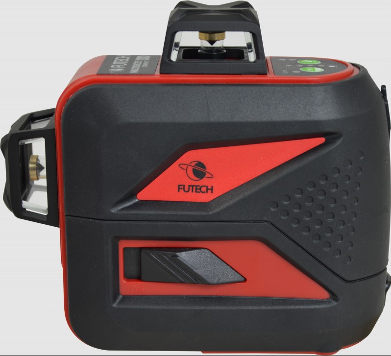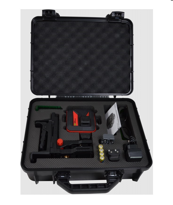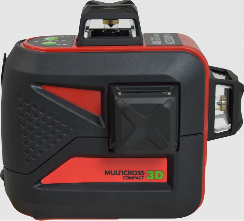 3D-Prismenlaser mit 1 grünen horizontalen Linie rundum und 2 vertikalen Linien rundum (= Lotlinie oben und unten + 4 Winkel von 90°).