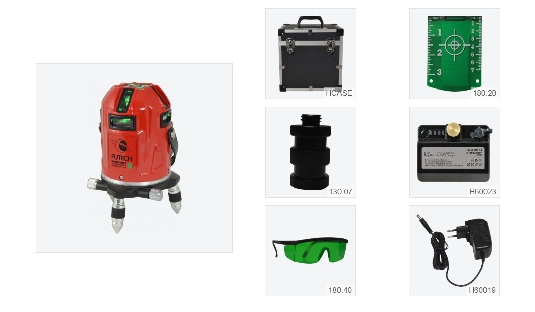 Kreuzlinienlaser mit 4 grünen horizontalen und 4 vertikalen Linien (= Lotlinie oben und unten + 4 Winkel von 90°).