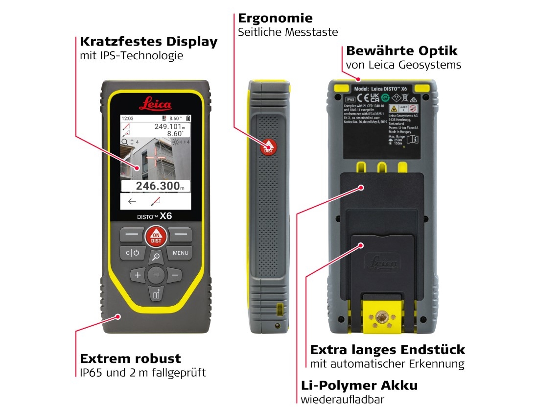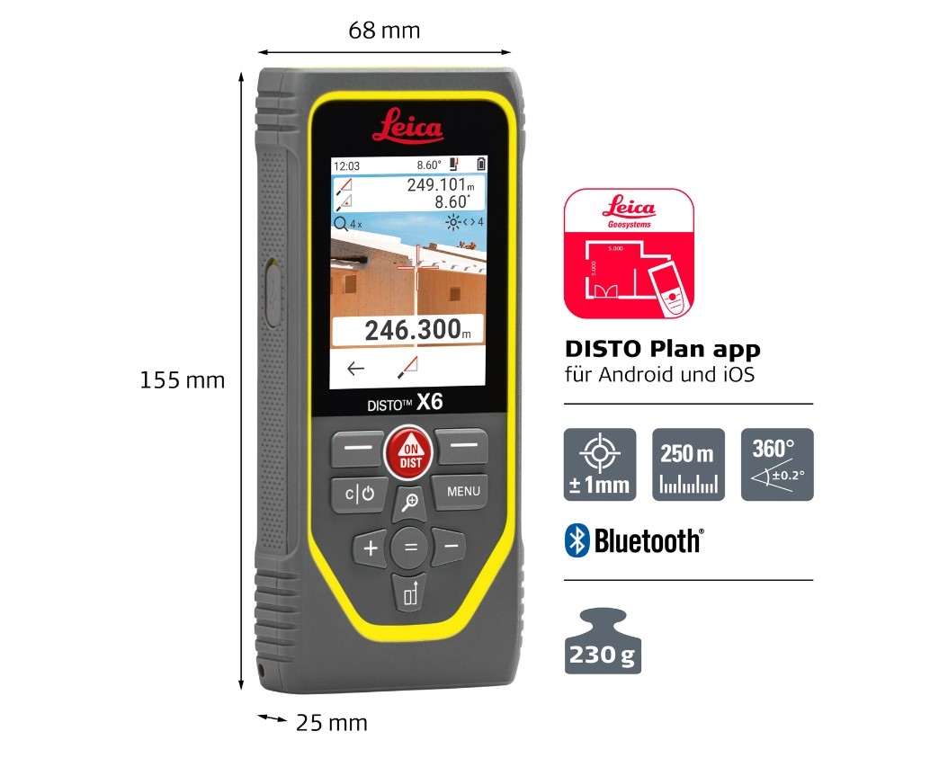 Der Leica DISTO™ X6 ist mit seinem äußerst robusten Gehäuse, der Schutzart IP65 und dem kratzfesten Displayglas besonders für den rauen Baustelleneinsatz geeignet. Die perfekte Kombination aus digitalem Zielsucher, ergonomischer Bedienung mit Touchscreen und zusätzlicher Messtaste an der Seite sowie hoher Funktionalität garantiert, dass jede Messaufgabe schnell und effizient erledigt werden kann. Anschließend können die Ergebnisse versendet und in der DISTO™ Plan App weiterverarbeitet werden.