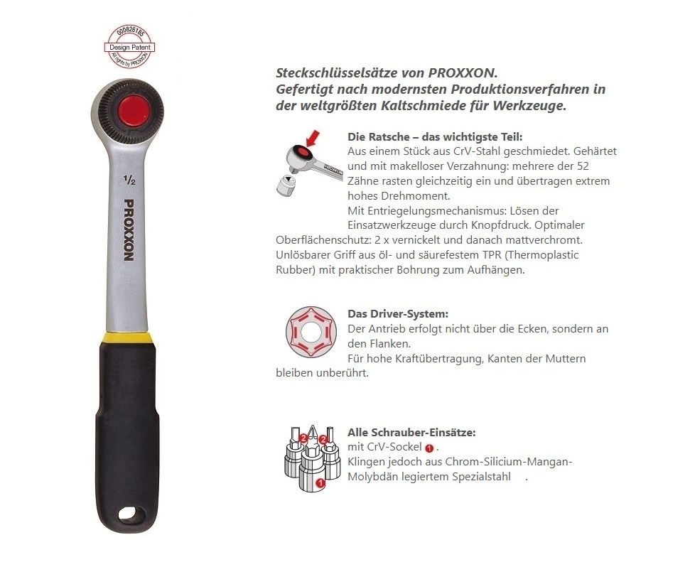 - Umschaltratsche mit Entriegelungs-Mechanismus.
