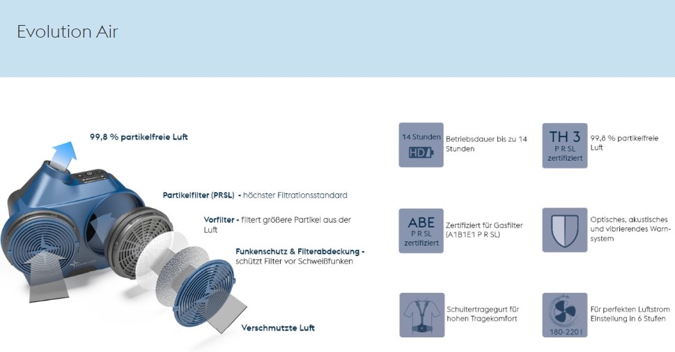Beide Systeme sind nach EN12941 zertifiziert und erfüllen die höchstmögliche Schutzklasse TH3, d. h. die Systeme schützen Ihre Lungen durch gefilterte Atemluft, die zu 99,8% partikelfrei ist. Unser bewährtes Evolution Air System bietet zusätzlich die Möglichkeit, Gasfilter mit Aktivkohlemedium zu verwenden. Diese Filter bieten einen verstärkten Schutz, nicht nur gegen Schweißrauche, sondern auch Gase. Damit betonen wir einmal mehr, wie wichtig das Thema persönlicher Arbeitsschutz für uns ist.